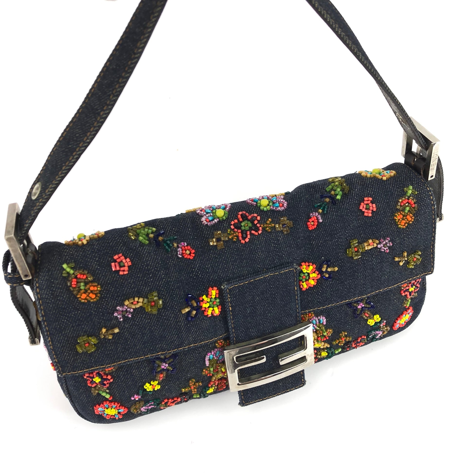 FENDI DENIM BEADED BAGUETTE SHOULDER BAG