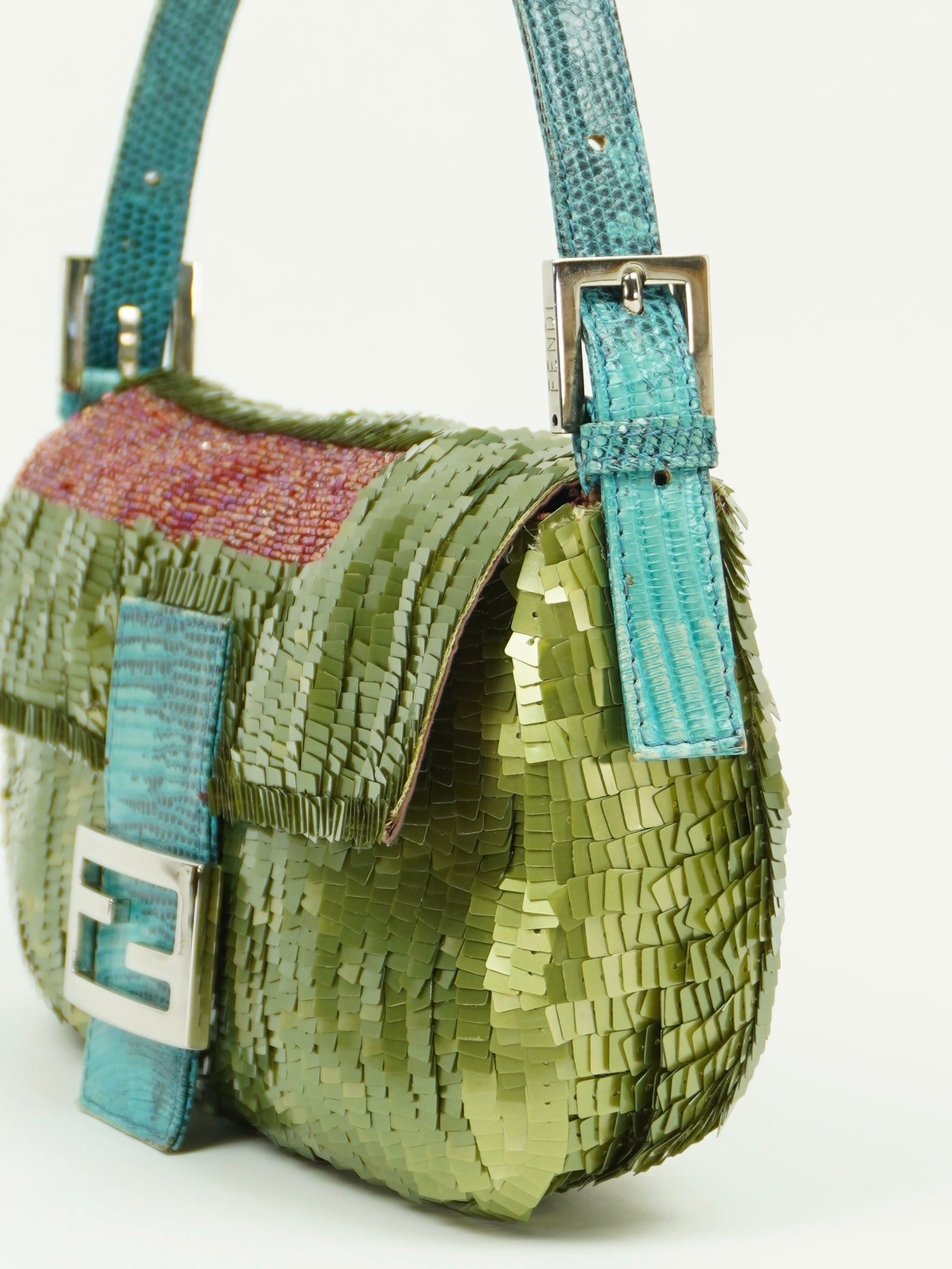 FENDI GREEN SEQUIN BAGUETTE WITH LIZARD TRIM